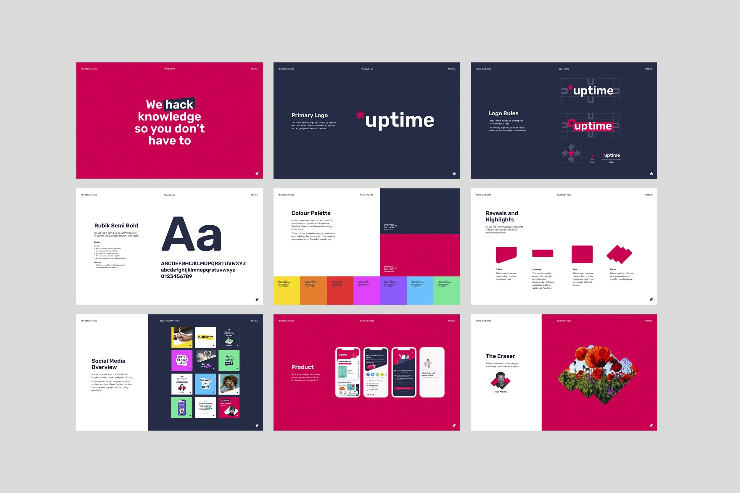Uptime is an app that hacks knowledge from leading books, courses, podcasts and documentaries, providing actionable insights - quickly and effortlessly in 5-minute stories. Their brand plays on the idea of ‘revealing’ the most important parts, the colour palette is energetic and youthful and their whole brand speaks with an empowering, friendly and witty tone of voice.